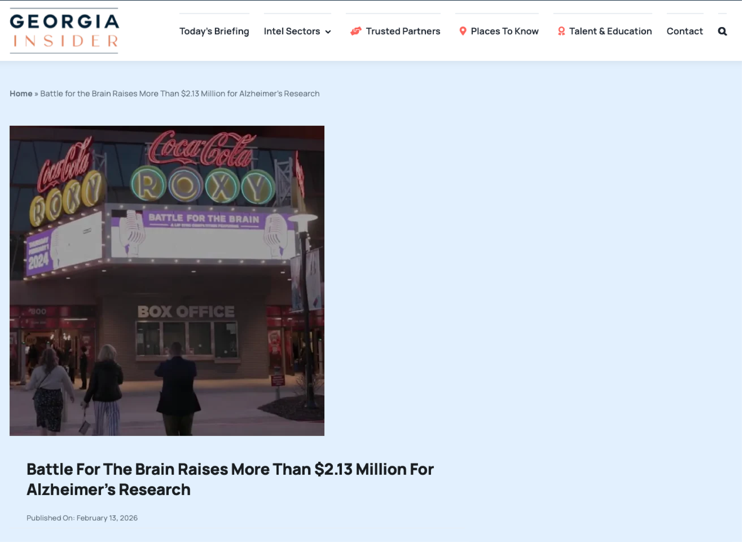 New study says Georgia can lead in brain health innovation – On Feb. 5, the Daughters Against Alzheimer’s hosted its signature event – Battle for the Brain – at the Coca-Cola Roxy in Cobb County, raising more than $2.13 million to benefit Emory’s Alzheimer’s Disease Research Center.