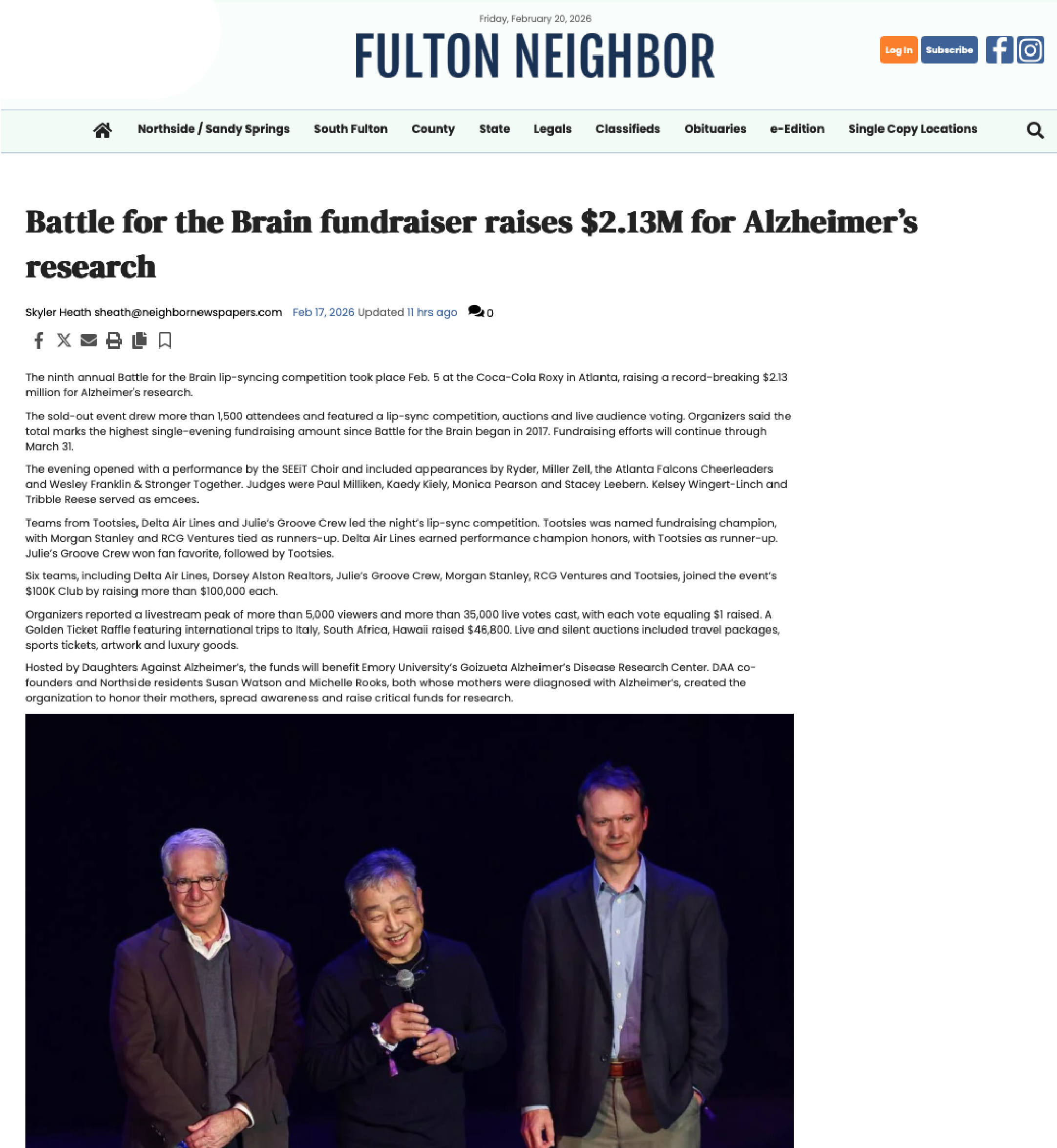 Battle For The Brain Event to raise $1 million for Alzheimer’s Research - On Feb. 2, Daughters Against Alzheimer's will host its sixth annual Battle for the Brain lip sync competition. This year's fundraising goal is $1 million. The primary recipient will be Emory's Goizueta Alzheimer's Disease Research Center.