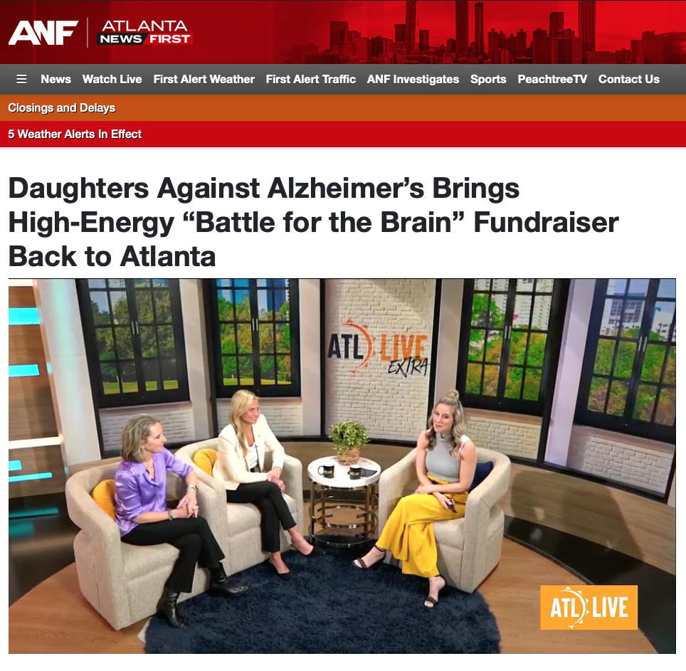 Battle for the Brain competition in Atlanta - Twelve local acts are taking the stage in an epic battle to raise money for a good cause. Dr. James Lah and Daughters Against Alzheimer's founders Susan Watson and Michelle Rooks joined Alyse Eady to talk all about the exciting fundraiser.attle for the Brain: Fight Against Alzheimer's; Goal to reach $1.75M for Alzheimer’s research.